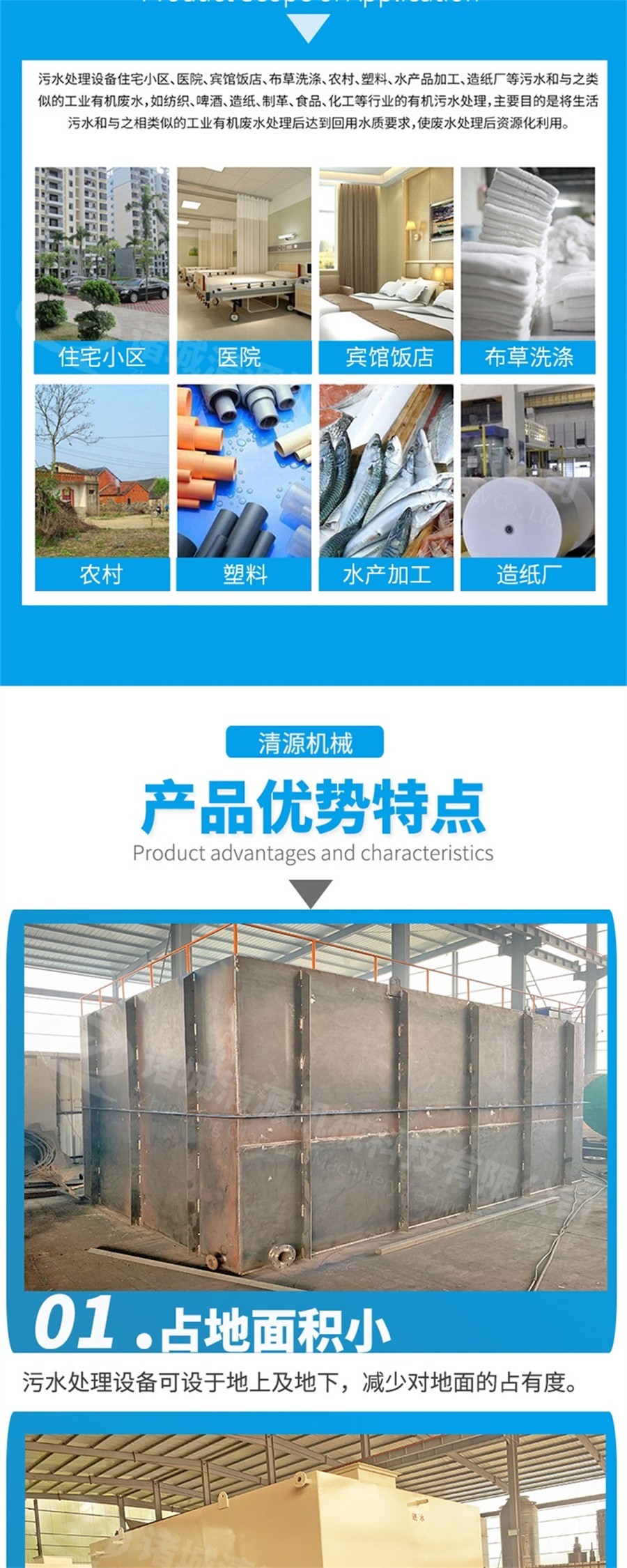 能夠處理生活系統綜合性廢水及其相類似的有機污水;采用玻璃鋼、不銹鋼結構,具有耐腐蝕、抗老化等優良特性,使用壽命長達 50 年以上 全套裝置施工簡單、操作容易,所有機械設備均為自動化控制,全部裝置可設置于地表以下,占地面積小。