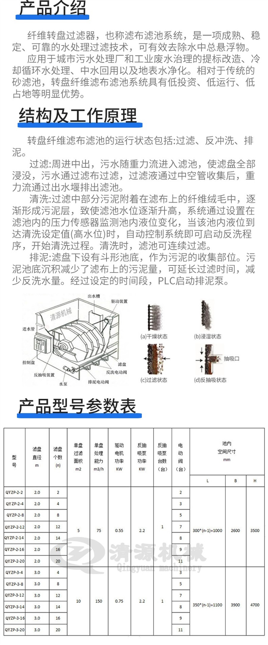 諸城清源機械科技有限公司生產的纖維轉盤過濾器由中心轉鼓、轉盤、反洗系統和配套控制電氣系統等組成。轉盤固定在中心轉鼓周圍,并與中心轉鼓具有連通孔。原水(污水)由中心轉鼓的一端開口流入轉鼓內,并通過連通孔進入各轉盤,轉盤兩側裝有過濾布,過濾布為不銹鋼絲或聚酯絲編織而成,過濾孔徑更小可達10μm。原水通過過濾布過濾后,清水流出過濾布,從過濾水出口排出系統外。隨著過濾的進行,過濾布內側的截留雜質不斷增加,過濾壓差隨之增加,透過濾布的水量減小。當雜質堆積到程度,中心轉鼓液位達到設定值,需要進行反洗,將過濾布內側堆積的雜質反洗出。反洗水泵抽取透過過濾布的清水,噴灑到過濾布外側,將過濾布內側的截留雜質沖洗下來,沖洗后污水掉落在接液盤內,然后排出裝置外。反洗時轉盤旋轉,反洗水噴灑不同角度的過濾布,直至轉盤旋轉一周,過濾布全部經過清洗,反洗停止,重新進入靜止過濾過程,直至再次進行反洗。
